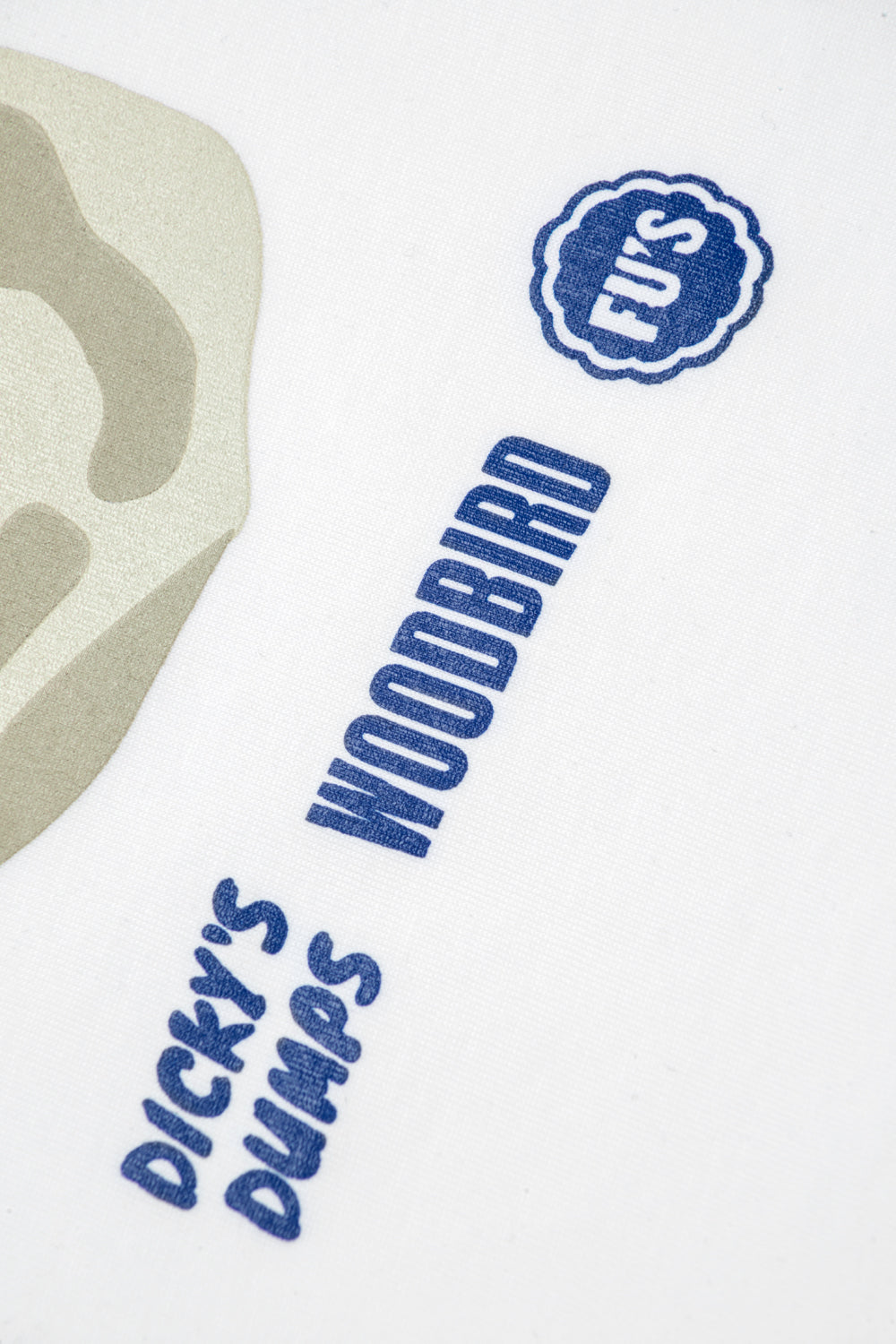 Woodbird flag label at left seam
